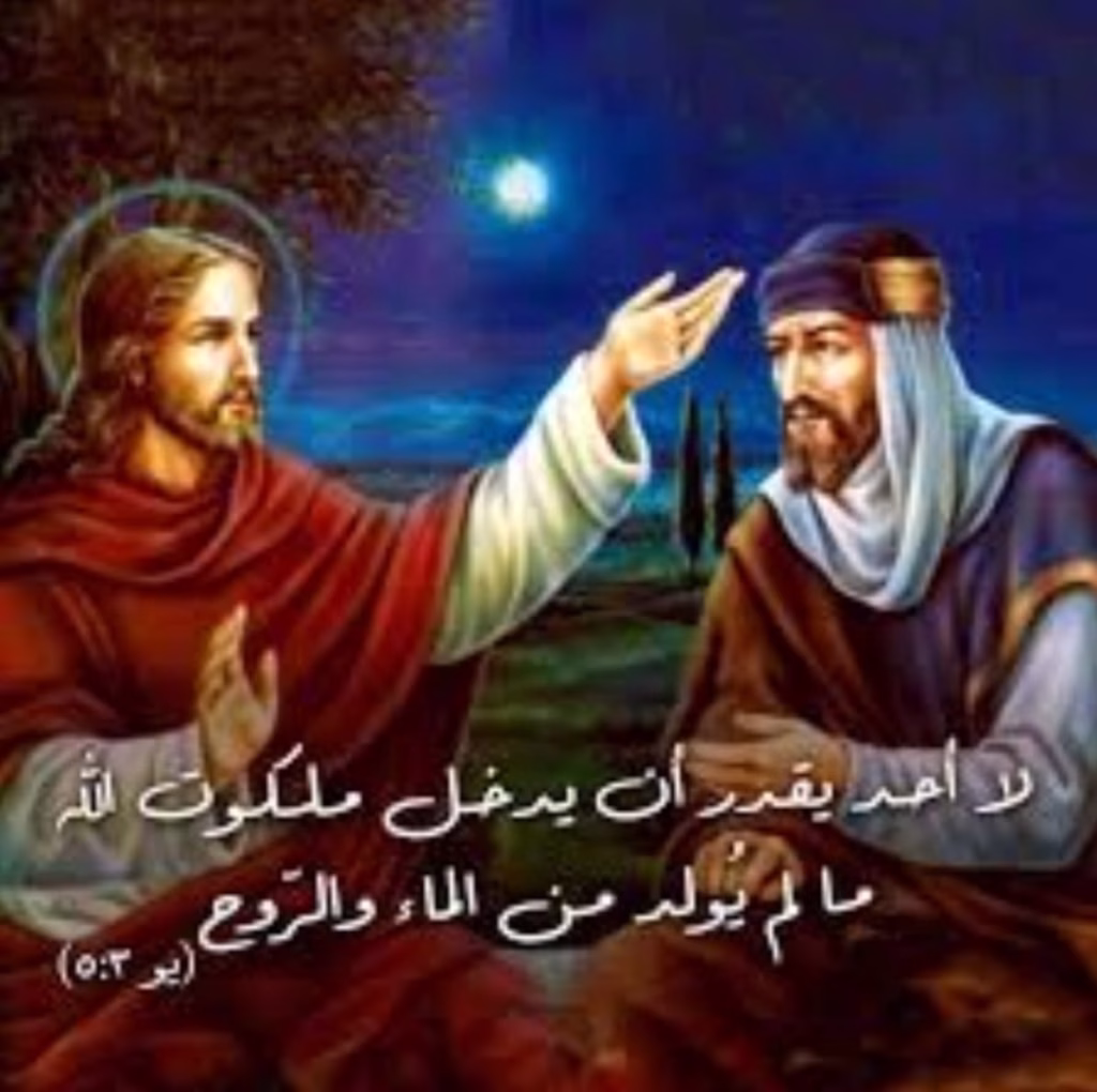 كان في الفَرِّيسِيِّينَ رَجُلٌ اسْمُه نيقوديمس وَكَانَ مِن رُؤَسَاءِ اليهود. فجاء إلى يسوع ليلاً وقال له: “رابِّي، نحن نعلم أَنَّكَ جِئتَ مِن لَدُنِ الله مُعَلِّمِاً، فَمَا مِنْ أَحَدٍ يَسْتَطِيعُ أَن يَأْتِيَ بتلك الآياتِ الَّتِي تَأْتِي بِها أَنتَ إِلَّا إِذَا كَانَ الله معه”. فَأَجَابَهُ يسوع: “الحَقَّ الحَقَّ أَقولُ لَكَ : مَا مِن أَحَدٍ يُمكِنَهُ أَن يَرَى مَلَكُوتَ الله إِلَّا إِذا وُلِدَ مِن عَلُ”. قَالَ لَهُ نيقوديموس : “كَيفَ يُمكنُ للإِنسان أَن يُولَدَ وهُوَ شَيخٌ كَبير ؟ أَيَسْتَطِيعُ أَن يَعُودَ إِلى بَطْنِ أُمِّهِ ويُولَد؟” أَجابَ يسوع: “الحَقَّ الحَقَّ أَقولُ لَكَ: ما مِن أَحَدٍ يُمكِنُهُ أَن يَدْخُلَ مَلَكُوتَ الله إِلَّا إِذا وُلِدَ مِنَ المَاءِ والرُّوح . فَمَولُودُ الجَسدِ يَكونُ جَسداً ومولودُ الرُّوحِ يَكُونُ روحاً. لا تَعْجَبْ مِن قَولي لَكَ : يَجِبُ عليكم أَن تُولَدوا مِن عَلُ. فَالرِّيحُ تَهُبُّ حَيثُ تَشَاء فَتَسْمَعُ صَوتَها ولكنَّكَ لا تَدْرِي مِن أينَ تَأْتِي وإِلى أَينَ تَذهَب. تِلكَ حالَةُ كُلِّ مَولودٍ للرّوح”. أجابه نيقوديموس :” كيف يكون هذا؟” أجاب يسوع:” أَأَنتَ مُعلّم في إسرائيل وتَجْهَلُ هذه الأَشياء ؟ الحَقَّ الحَقَّ أقول لك: إنّنا نتكلَّم بِمَا نَعْلَم، ونَشَهَدُ بِمَا رَأَيْنَا وَلَكِنَّكُم لا تَقبَلُونَ شَهَادَتَنَا ، فَإِذا كُنتُم لَا تُؤْمِنُونَ عِندَمَا أُكَلِّمُكُم فِي أُمورِ الأَرْضِ فَكَيفَ تُؤْمِنُونَ إِذا كَلَّمَتُكُم فِي أُمورِ السَّماء ؟ فما مِنْ أَحَدٍ يَصْعَدُ إِلَى السَّمَاءِ إِلَّا الَّذِي نَزَلَ مِنَ السَّماء وهو ابن الإنسان. وكما رَفَعَ مُوسى الحَيَّةَ فِي البَرِّيَّة فكذلِكَ يَجِبُ أَن يُرفَعَ ابنُ الإِنسان لِتَكونَ بِهِ الحَياةُ الأَبديَّةُ لِكُلِّ مَن يُؤْمِن. فَإِنَّ الله أَحبَّ العالَمَ حَتَّى إِنَّه جَادَ بِابْنِهِ الوحيد لكي لا يَهْلِك كُلُّ مَن يُؤْمِنُ به بل تكون له الحياة الأبدية.”