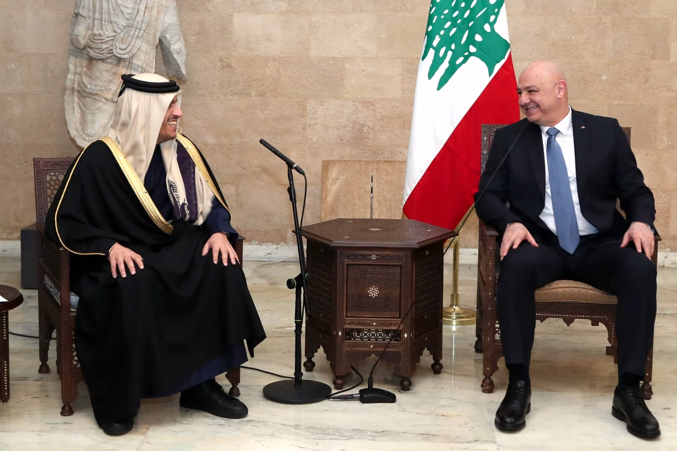 رئيس الجمهورية: من جهته، قال رئيس الجمهورية العماد جوزاف عون لرئيس وزراء قطر:” لطالما كانت قطر إلى جانب لبنان، مساندةً للبنانيين في الأوقات الصعبة. ونتطلع إلى عودة الأشقاء القطريين إلى لبنان، ونُثمّن عالياً الدور القطري في دعم اقتصاد لبنان، لا سيما في قطاع النفط والغاز، ونتطلع إلى استئناف أعمال التنقيب قريباً بالتعاون مع توتال”.