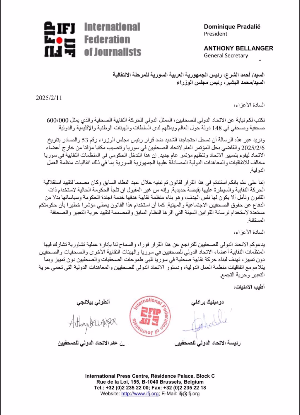 وجاء في رسالة الاتحاد الدولي للصحفيين إلى الرئيس السوري أحمد الشرع :”إﻧﻨﺎ ﻋﻠﻰ ﻋﻠﻢ ﺑﺎﻧﻜﻢ اﺳﺘﻨﺪﺗﻢ ﻓﻲ ھﺬا اﻟﻘﺮار ﻟﻘﺎﻧﻮن ﺗﻢ ﺗﺒﻨﯿﮫ ﺧﻼل ﻋﮭﺪ اﻟﻨﻈﺎم اﻟﺴﺎﺑﻖ وﻛﺎن ﻣﺼﻤﻤﺎ ﻟﺘﻘﯿﯿﺪ اﺳﺘﻘﻼﻟﯿﺔ اﻟﺤﺮﻛﺔ اﻟﻨﻘﺎﺑﯿﺔ واﻟﺴﯿﻄﺮة ﻋﻠﯿﮭﺎ ﺑﻘﺒﻀﺔ ﺣﺪﯾﺪﯾﺔ. وإﻧﮫ ﻣﻦ ﻏﯿﺮ اﻟﻤﻘﺒﻮل ان ﺗﻠﺠﺄ اﻟﺤﻜﻮﻣﺔ اﻟﺤﺎﻟﯿﺔ ﻻﺳﺘﺨﺪام ذات اﻟﻘﺎﻧﻮن وﻧﺄﻣﻞ أﻻ ﯾﻜﻮن ﻟﮭﺎ ﻧﻔﺲ اﻟﮭﺪف، وھﻮ ﺑﻨﺎء ﻣﻨﻈﻤﺔ ﻧﻘﺎﺑﯿﺔ ھﺪﻓﮭﺎ ﺧﺪﻣﺔ اﺟﻨﺪة اﻟﺤﻜﻮﻣﺔ وﺳﯿﺎﺳﺎﺗﮭﺎ ﺑﺪﻻ ﻣﻦ اﻟﺪﻓﺎع ﻋﻦ ﺣﻘﻮق اﻟﺼﺤﻔﯿﯿﻦ اﻻﺟﺘﻤﺎﻋﯿﺔ واﻟﻤﮭﻨﯿﺔ.وأن اﺳﺘﺨﺪام ھﺬا اﻟﻘﺎﻧﻮن ﯾﻌﻄﻲ ﻣﺆﺷﺮا ﺧﻄﯿﺮا ﺑﺄن ﺣﻜﻮﻣﺘﻜﻢ ﻣﺴﺘﻌﺪة ﻻﺳﺘﺨﺪام ﺗﺮﺳﺎﻧﺔ اﻟﻘﻮاﻧﯿﻦ اﻟﺴﯿﺌﺔ اﻟﺘﻲ اﻗﺮھﺎ اﻟﻨﻈﺎم اﻟﺴﺎﺑﻖ واﻟﻤﺼﻤﻤﺔ ﻟﺘﻘﯿﯿﺪ ﺣﺮﯾﺔ اﻟﺘﻌﺒﯿﺮ واﻟﺼﺤﺎﻓﺔ اﻟﻤﺴﺘﻘﻠﺔ.