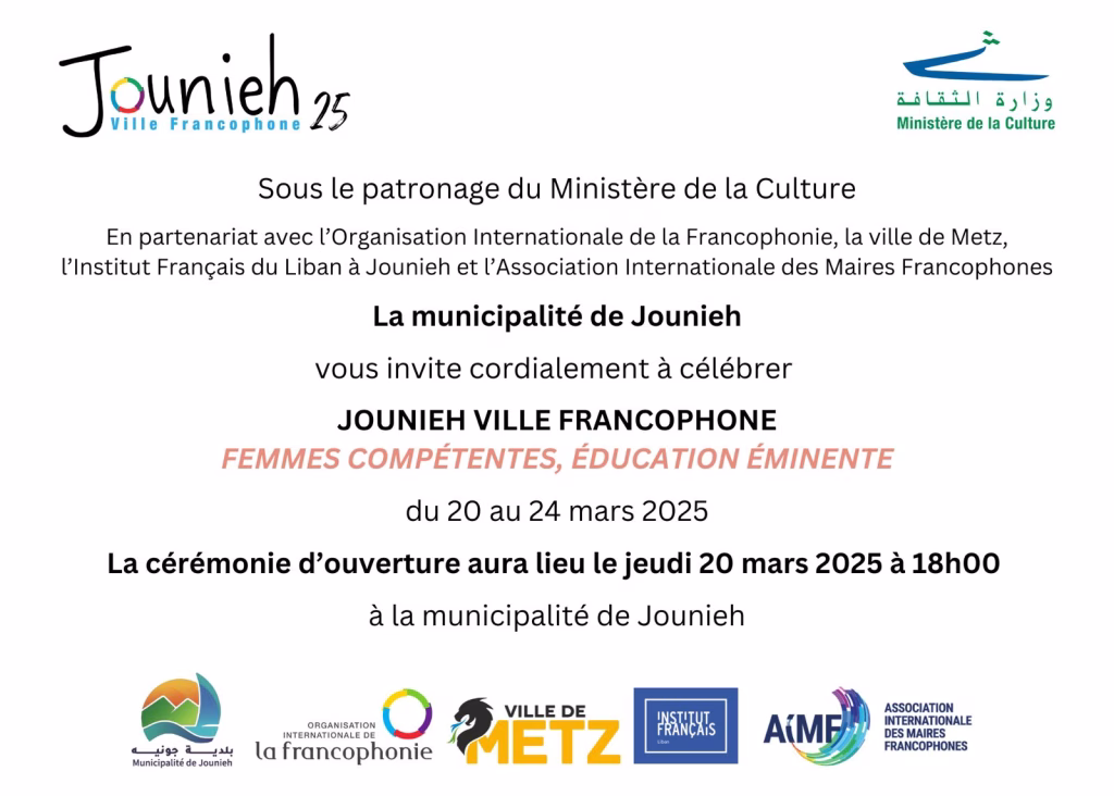برعاية وزارة الثقافة في لبنان وبالشراكة مع المنظمة الدولية للفرانكوفونيةومدينة متز الفرنسية والمعهد الفرنسي في لبنان -جونية والرابطة الدولية لرؤساء بلديات الفرانكوفونيةوبلدية جونية بالتعاون مع جمعية ارتإستدامة Artistidama ،يقام معرض لوحات فنية تحت عنوان( المرأة عمل فني ) من 20 لغاية 24 أذار ، في بلدية جونية الإفتتاح الساعة السادسة مساء.