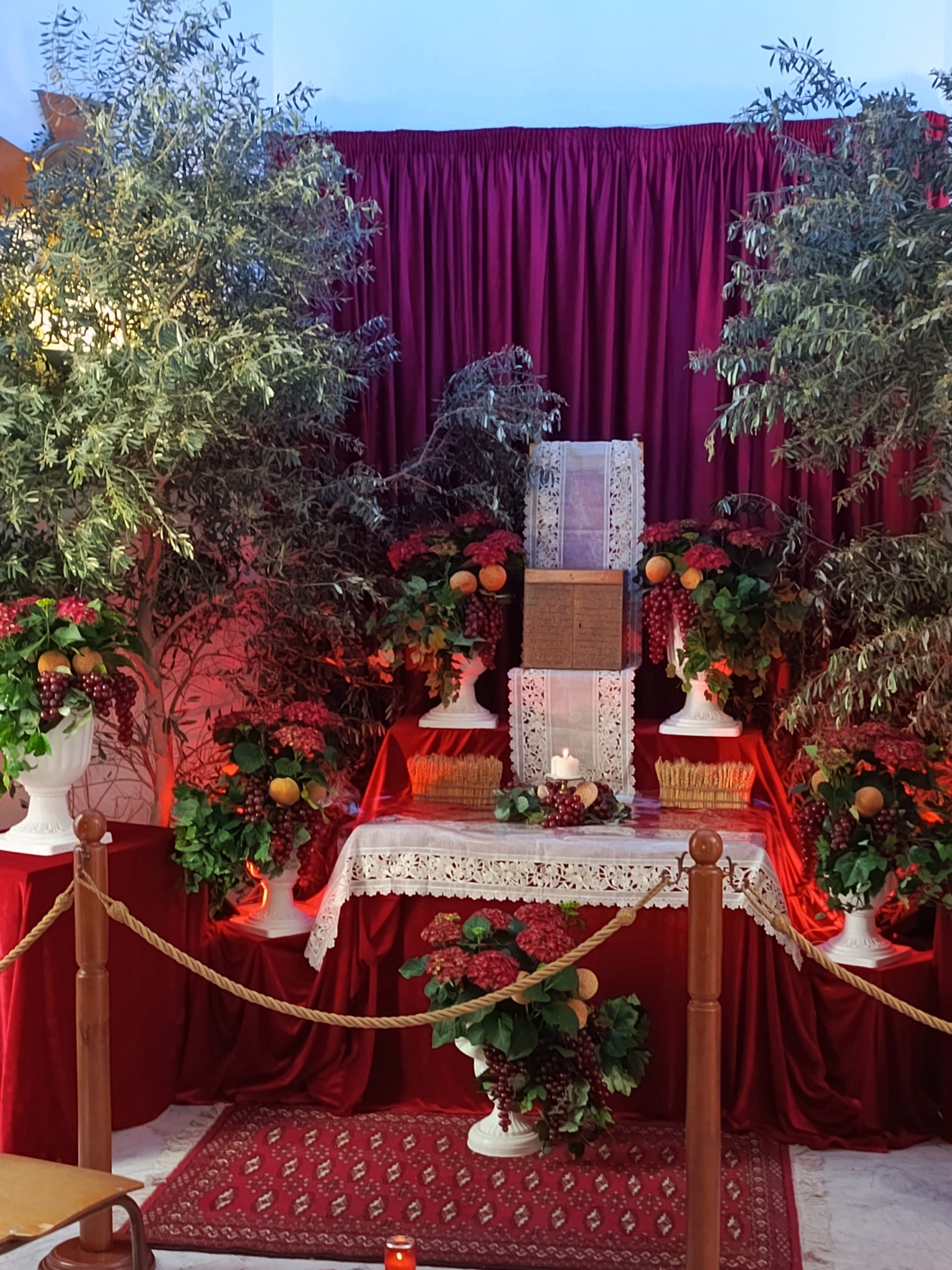 وشاح أسود أيضًا، وعلى الجانبين المقاعد الخشبيّة وقد أُبدلت طريقة صفّها ليتّسع المكان أكثر، فنضع العقد إلى جانب الأزهار الأخرى، وقد تفاوتت، على بساطتها، من رزمة ورق زيتون، أو زهرة زنبق أو وردة، وسواها…فالأصل النية، والكلّ مؤمنون. وتبدأ الرتبة، وتصدح الأصوات على وقعٍ حزين خاص بالمناسبة، وتأبى بعض الأصوات الناشزة إلاّ المشاركة على طريقتها؛ وبعد القراءات والأناجيل والعظة، يحين الوقت للتطواف بالنعش، وكان كبار الضيعة يتولّون مهمّة حمله، فليس في الأمر مزاح؛ وننطلق من داخل الكنيسة، وندور في الساحة ثلاث دورات، ثمّ يقف الحاملون وهم رافعون النعش على الباب، فنمرّ تحته متبرّكين. وتنتهي الرتبة، ونعود إلى البيوت، لا كمن يعود من ذكرى، بل كمن يعود من مأتم حقيقي، والعديد من المآقي ملأى بالدموع.