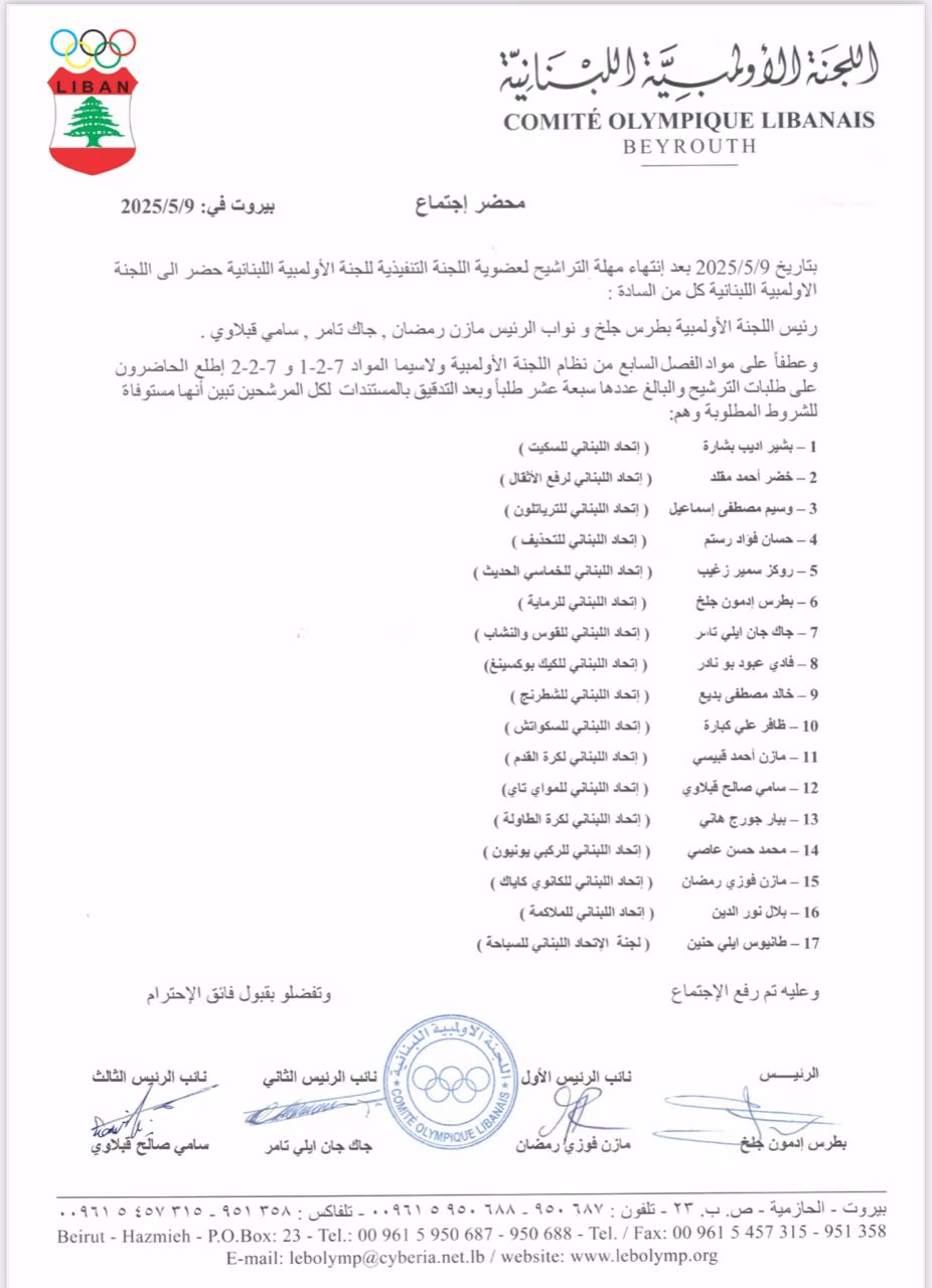 عقدت اللجنة الأولمبية اللبنانية وبحضور رئيس اللجنة الدكتور بطرس جلخ ونواب الرئيس المهندس مازن رمضان وجاك تامر والغراند ماستر سامي قبلاوي وذلك عند الثالثة عصر اليوم الجمعة ٩ أيار ٢٠٢٥ وعقدت في مقر اللجنة بمنطقة الحازمية وذلك بعد إنتهاء فترة تقديم طلبات الترشيح لعضوية اللجنة التنفيذية في الإنتخابات المقرّرة يوم ١٦ أيلول الحالي في مقر اللجنة وكانت كلمة للدكتور جلخ أكّد فيها أن الجمعية العمومية لإنتخابات لجنة تنفيذية جديدة والمقرّرة يوم ١٦ أيار الحالي هي الشرعية بحسب المراسلات الواردة من الجهات المعنية في اللجنة الأولمبية الدولية والمجلس الأولمبي الآسيوي والتأكيد على عدم التدخلات الحكومية وأشار إلى أن وزيرة الشباب والرياضة نورا بيرقداريان تعمل على تسوية ونحن معها شرط أن تكون عادلة ولا تأخذ ببعض المعلومات المغلوطة خصوصاً في ملفات مالية ما يسيء للرياضة اللبنانية سيما وأن اللجنة الأولمبية اللبنانية هي الممثل الوحيد والشرعي بالتمثيل الوطني في المحافل الخارجية داعياً لملاقاة اليد الممدودة لتسوية تنجز قبل تاريخ ١٦ أيار الحالي .