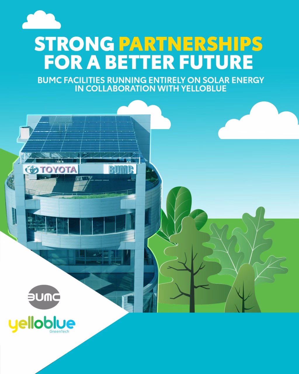 في إطار التزامها المستمر بالاستدامة، وبالشراكة مع Yelloblue، نجحت شركة BUMC s.a.l. في تركيب أنظمة طاقة شمسية في منشآتها في حرش تابت، الزلقا، والمكلس. هذا الإنجاز لا يدعم فقط أهداف تويوتا العالمية في الحياد الكربوني، بل يُعزّز أيضاً دور BUMC في تعزيز اعتماد الطاقة النظيفة في لبنان. وتأتي هذه المبادرة بالتوازي مع برامج الشركة المتنامية في مجال السيارات الهجينة والكهربائية، مما يعكس نهجاً متكاملاً نحو تنقل وعمليات أكثر استدامة.