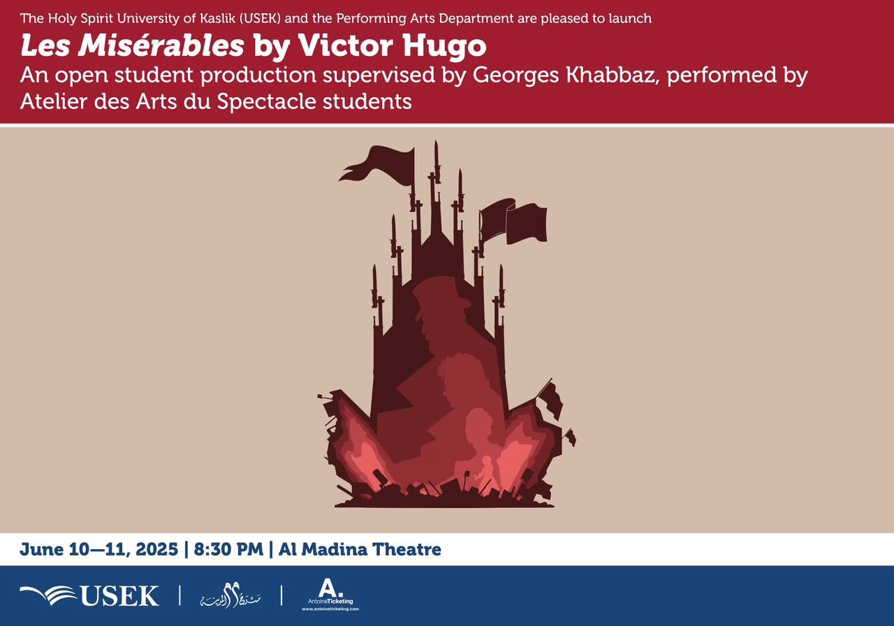 في أمسية منتظرة تجمع بين الفن والتعليم، يقدّم طلاب “محترف فنون العرض” في جامعة الروح القدس – الكسليك عرضًا مسرحيًا موسيقيًا لواحدة من أعظم الروايات الكلاسيكية في الأدب الفرنسي: “البؤساء” لفيكتور هوغو، وذلك مساء الثلاثاء والأربعاء 10 و11 حزيران 2025، الساعة 8:30 مساءً، على خشبة “مسرح المدينة” في بيروت.