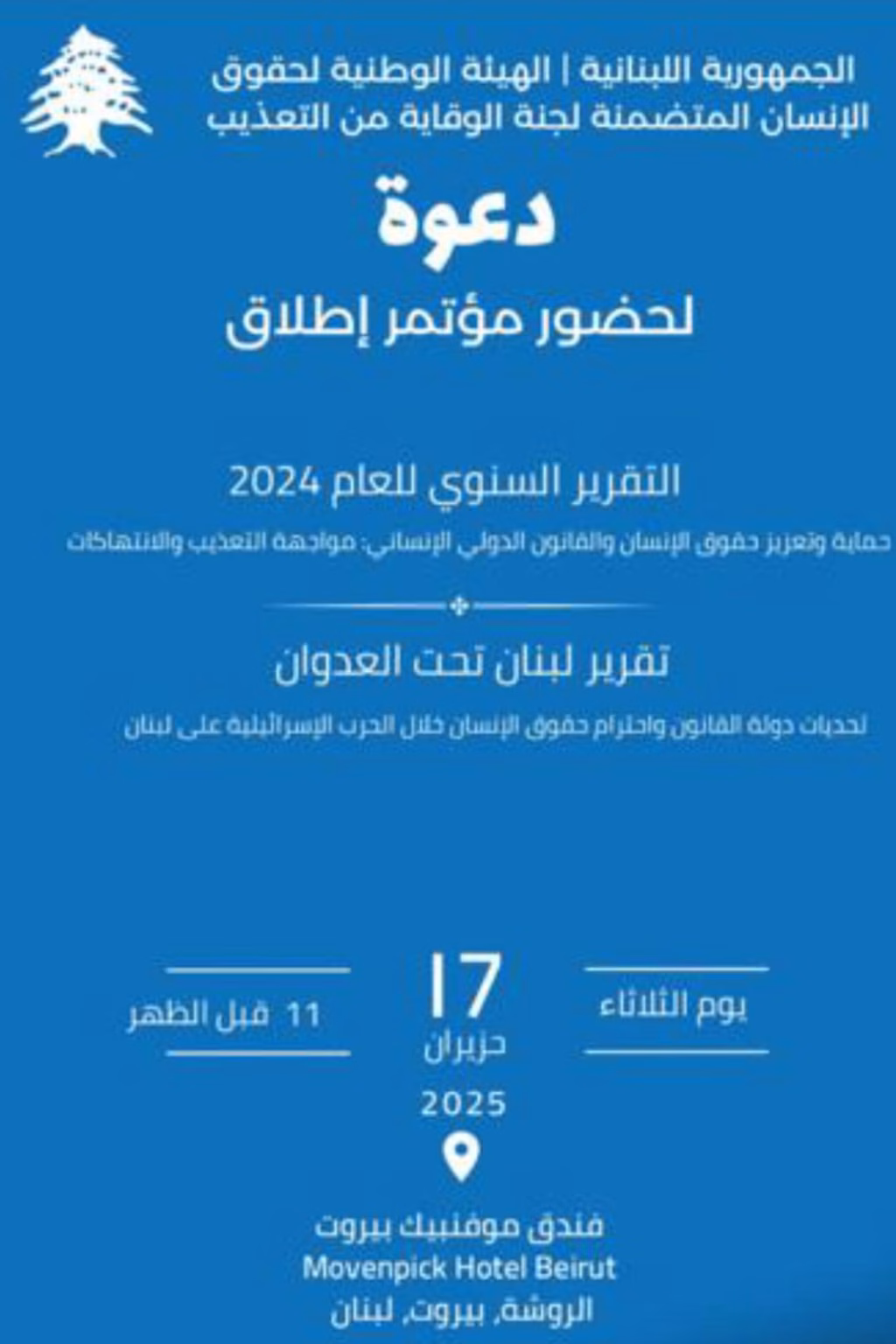 تطلق الهيئة الوطنيّة لحقوق الإنسان المتضمنة لجنة الوقاية من التعذيب، تقريرها السنوي بعنوان: “تقرير لبنان تحت العدوان”، وذلك الساعة الحادية عشرة من قبل ظهر الثلاثاء ١٧ حزيران الجاري في فندق موفنبيك في بيروت. 16 يونيو، 2025 ShareShareShare Previous Postقراءة في صحف اليوم Next Postالمعراوي افتتح في معهد باسل فليحان برنامجاً تدريبياًعن “مكافحة تبييض الأموال المتعلّقة بالتهرب الضريبي”