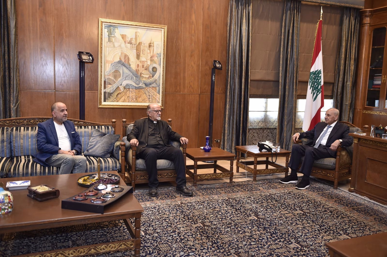 الرئيس نبيه برّي مستقبلًا المونسنيور كميل مبارك وكاتب هذه السطور