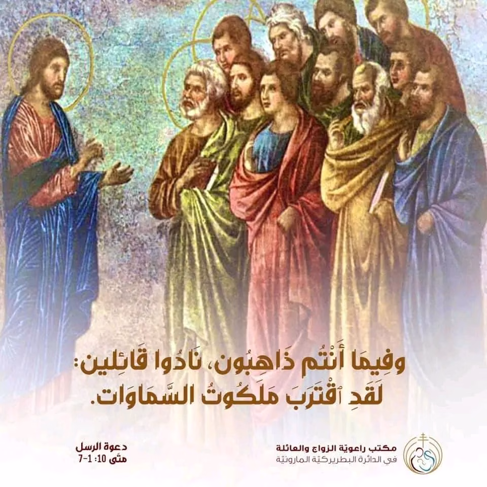 هؤُلاءِ الٱثْنَا عَشَرَ أَرْسَلَهُم يَسُوع، وقَدْ أَوْصَاهُم قَائِلاً: «لا تَسْلُكُوا طَرِيقًا إِلى الوَثَنِيِّين، ولا تَدْخُلُوا مَدِيْنَةً لِلسَّامِرِيِّين، بَلِ ٱذْهَبُوا بِالحَرِيِّ إِلى الخِرَافِ الضَّالَّةِ مِنْ بَيْتِ إِسْرَائِيل. وفِيمَا أَنْتُم ذَاهِبُون، نَادُوا قَائِلين: لَقَدِ ٱقْتَرَبَ مَلَكُوتُ السَّمَاوَات.”