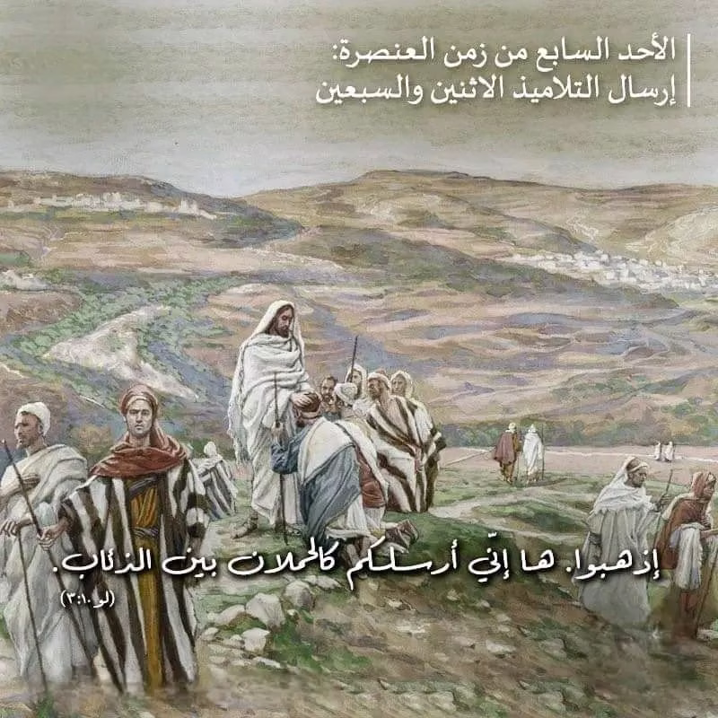 وبعد ذلِكَ، أَقامَ الرَّبُّ اثنين وسبعينَ تِلميذا آخَرِين، وأَرسَلَهُمُ اثنين اثنين، يتَقَدَّمُونَه إلى كل مدينة أو مكان أوشك هو أن يَذْهَبَ إِلَيهِ. وقالَ لَهم: الحَصادُ كثيرٌ ولَكِنَّ الفَعَلَةَ قَليلون، فاسأَلُوا رَبَّ الحَصَادِ أَن يُرْسِلَ الفَعَلَةَ إِلَى حَصَادِهِ إِذْهَبوا! فهاءَنَذا أُرْسِلُكُم كَالحُملانِ بَينَ الذَّئاب. لا تَحْمِلُوا كِيسَ دَرَاهِم ولا مِذْوَدَ ولا حِذاءً ولا تُسَلِّموا في الطَّريقِ على أحد. وأَيَّ بَيتٍ دَخَلتُم، فقولوا أَوَّلاً: السَّلامُ على هذا البيت فإن كانَ فِيهِ ابْنُ سَلام، فَسَلامُكُم يَحِلُّ به، وإلا عادَ إِلَيْكُم. وأَقيموا في ذلكَ البَيتِ تأكُلُونَ وتَشْرَبُونَ مِمَّا عِندَهم، لأَنَّ العَامِلَ يَستَحِقُّ أَجرَتَه، ولا تَنتَقلوا مِن بَيت إلى بيت.