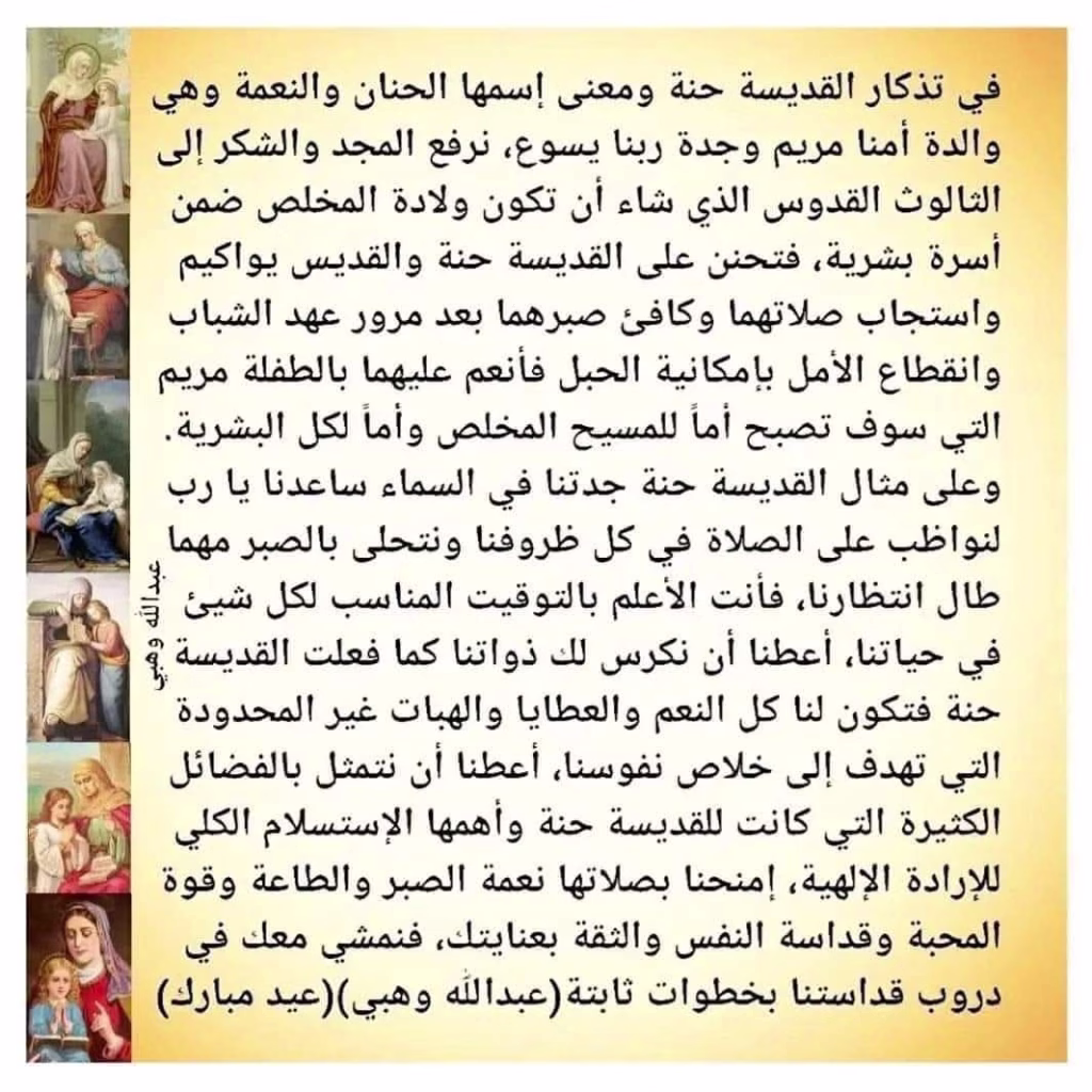 التبشير الملائكي في عيد القديسة حنة والدة مريم العذراء 25 يوليو، 2025 عيد القديسة حنة والدة أمنا مريم وجدة الإله المتأنس ربنا يسوع المسيح…..عيد مبارك للجميع فلترافقنا صلاتها ShareShareShare Previous Postتكيف الأب بولس القزي من قبل الرهبانية المارونية ملف الأخ اسطفان نعمة….من الطوباوية الى القداسة Next Postالحملة الوطنية لتحرير جورج عبد الله تدعو الجميع إلى أوسع مشاركة وحضور جماهيري على طريق مطار بيروت لاستقباله بدءاً من الساعة الواحدة ظهراً..