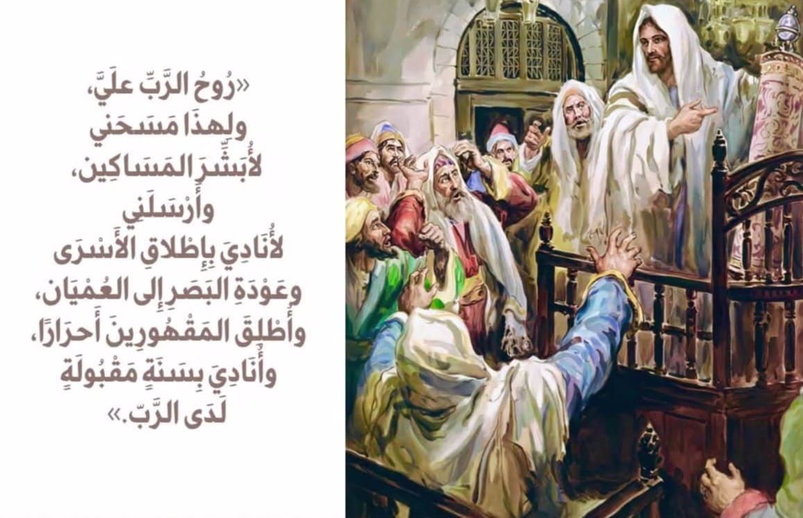 “رُوحُ الرَّبِّ عَلَيَّ لِأَنَّهُ مَسَحَني لِأُبَشِّرَ الفُقَراء وأَرسَلَني لأُعْلِنَ لِلمَأْسورينَ تَخْلِيَةَ سَبِيلِهِم وللعميانِ عَودَةَ البَصَرِ إِلَيهِم وأفَرِّجَ عن المظلومين وأعلِنَ سنةَ رِضاً عندَ الرَّبِّ.”