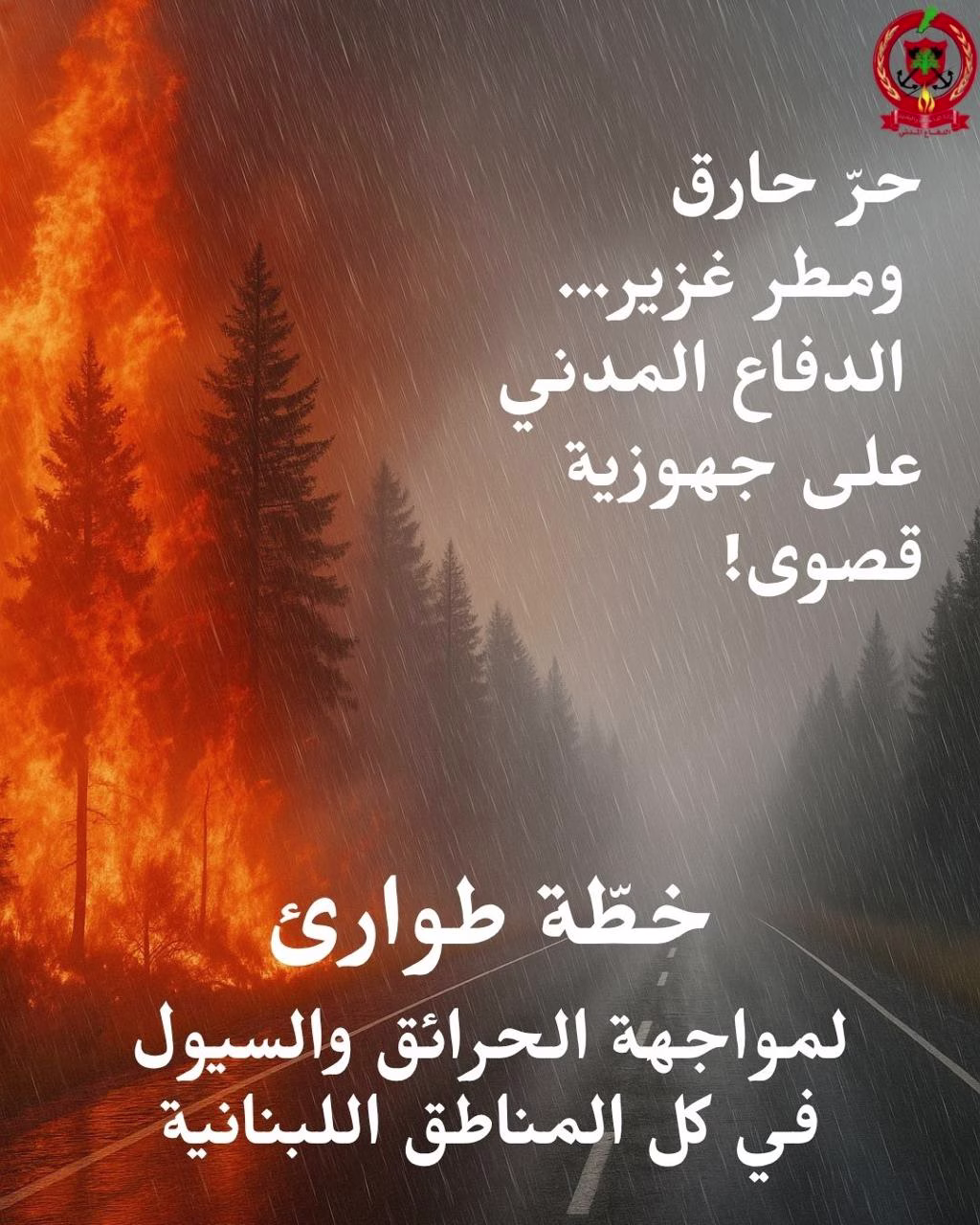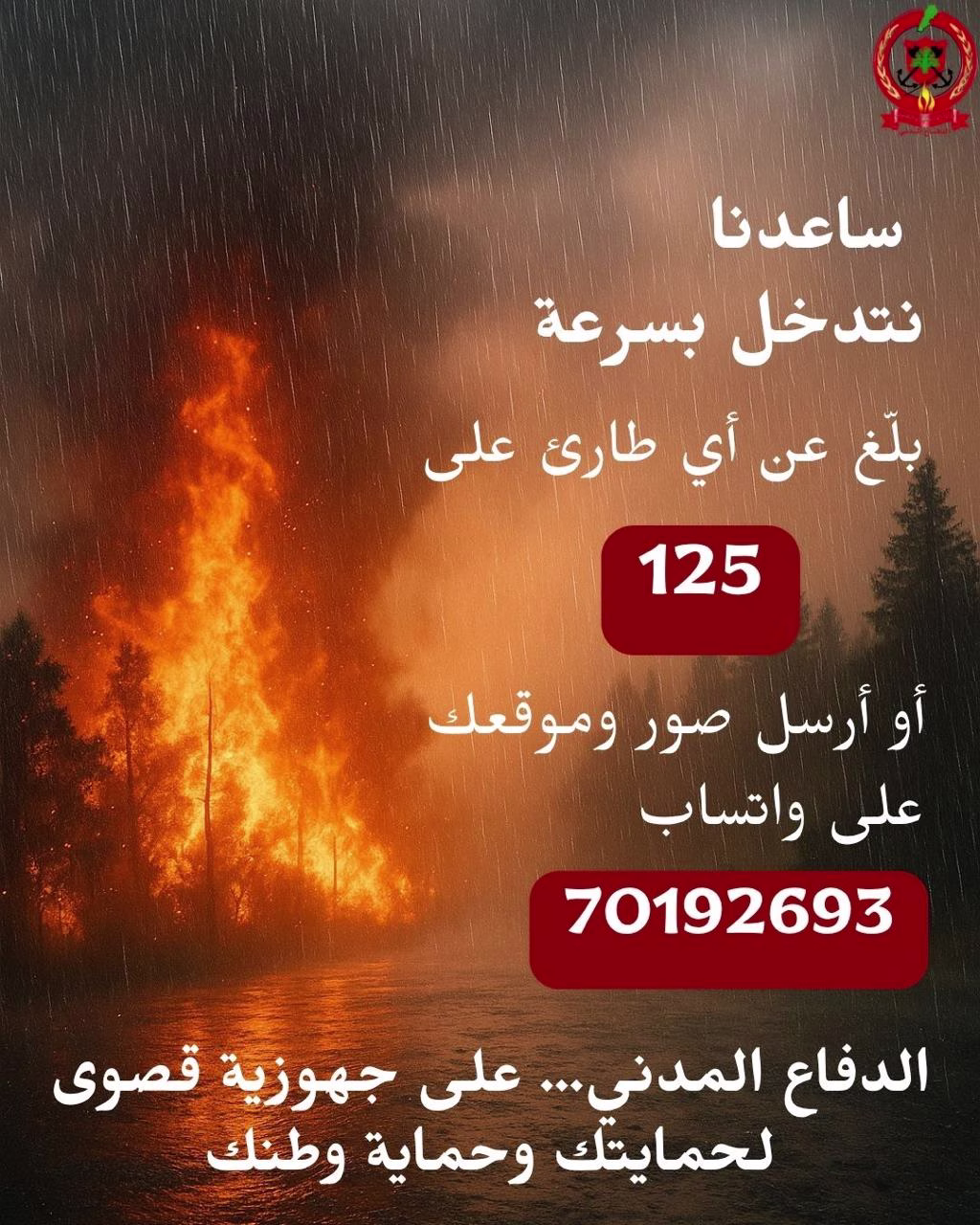 وتؤكّد المديرية العامة للدفاع المدني على أهمية التواصل فورًا على الرقم 125 للتبليغ عن أي طارئ، أو إرسال الصور والموقع الجغرافي عبر تطبيق واتساب على الرقم 70192693 لتسهيل التدخل السريع وتقديم المساعدة الفورية.