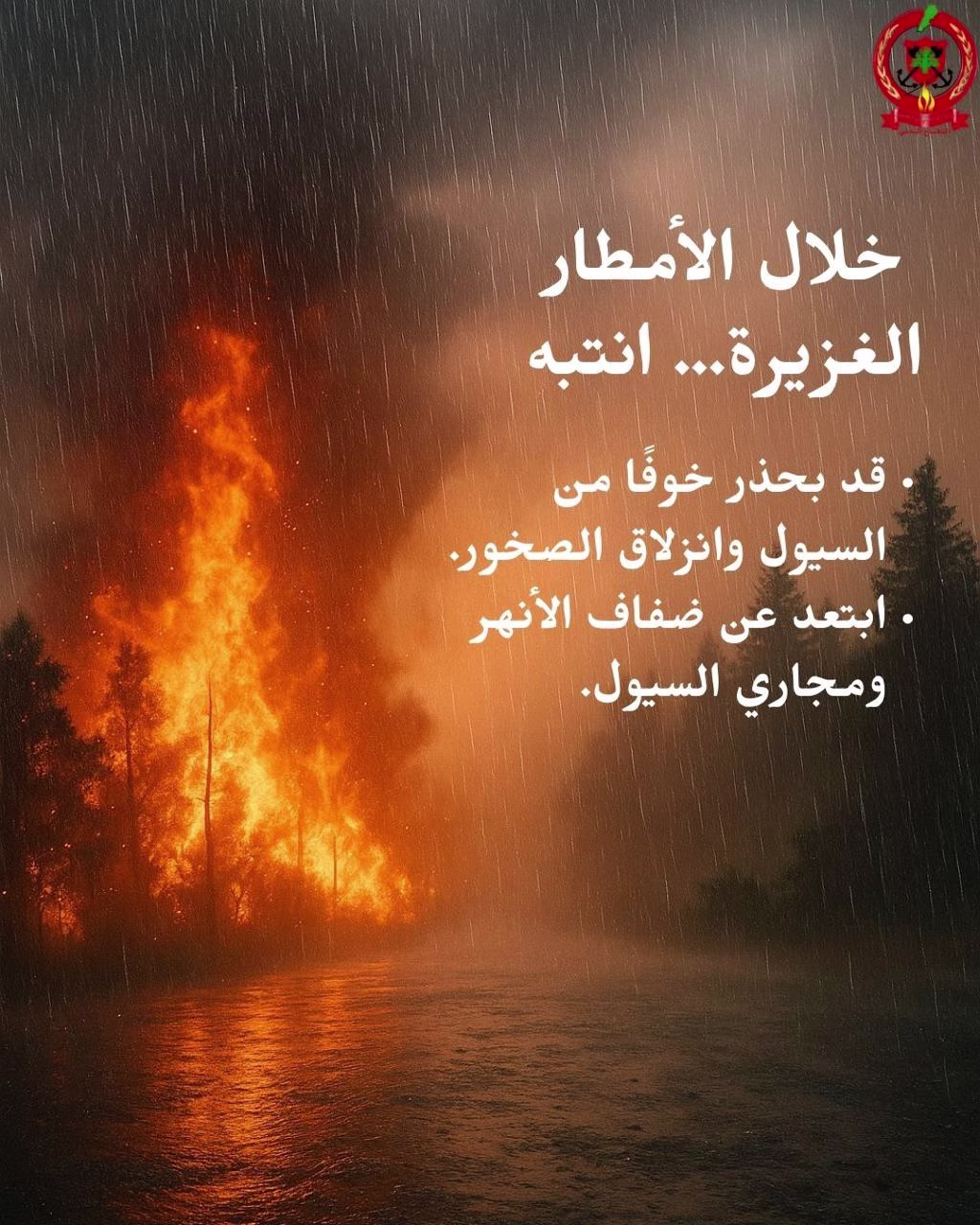 - الإبلاغ الفوري عن أي دخان أو حريق فور مشاهدته. ثالثًا – التنبيه خلال الأمطار المفاجئة: