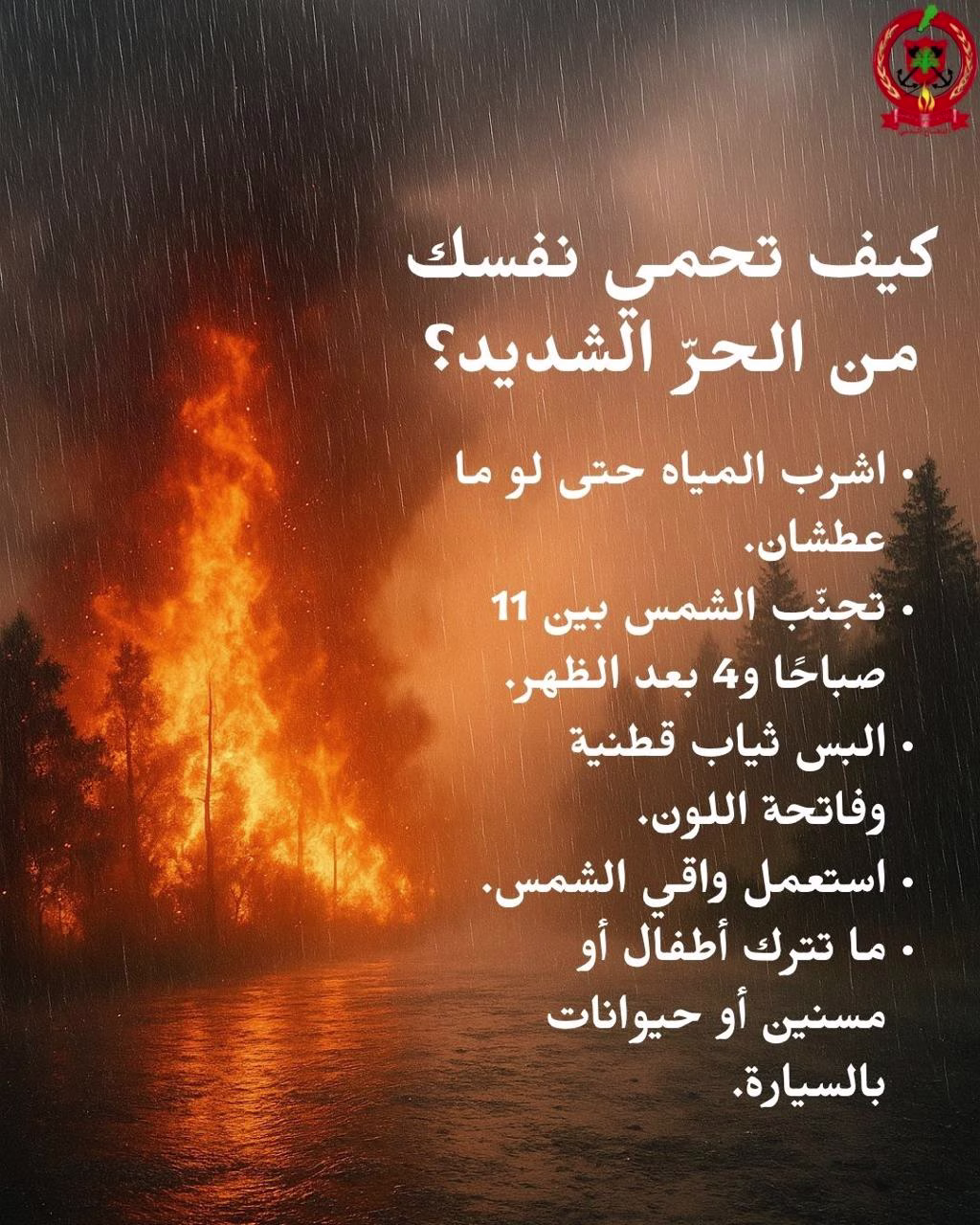 في مواجهة موجة الحرّ الشديدة والتقلّبات الجوية المفاجئة : الدفاع المدني يحذّر المواطنين من مخاطر الحرارة والحرائق والسيول