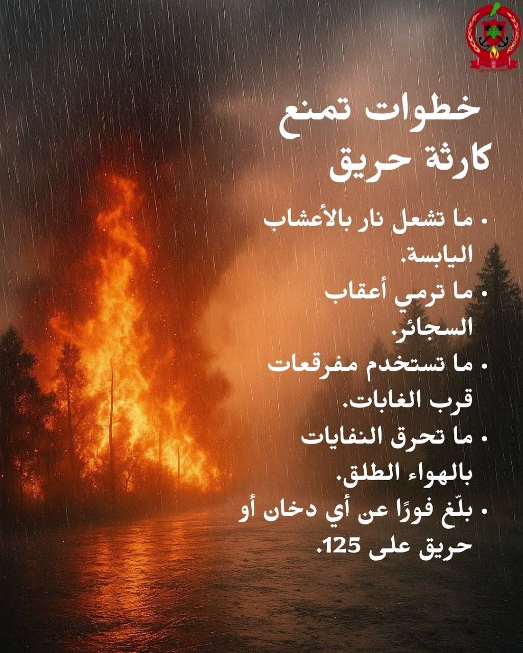 - عدم استخدام المفرقعات أو الألعاب النارية بالقرب من الغابات أو الأعشاب اليابسة.