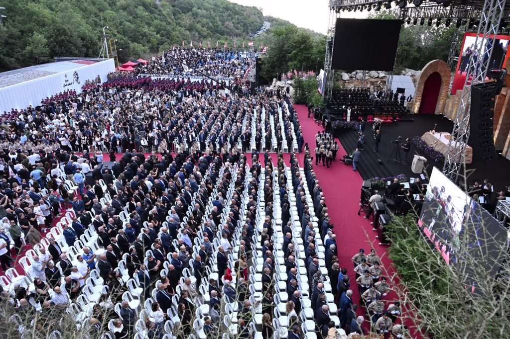 هذه المواقف أطلقها جعجع عقب القداس الاحتفالي في ذكرى شهداء المقاومة اللبنانيّة، في معراب، تحت عنوان”نجرؤ ليبقى لبنان” الذي نظّمته “القوات اللبنانية”، “برعاية البطريرك الماروني الكاردينال مار بشارة بطرس الراعي، ممثّلا بالنائب البطريركي على منطقة جونيه المطران يوحنا رفيق الورشا. وشارك كاثوليكوس بيت كيليكيا للأرمن الأرثوذكس البطريرك آرام الأول كيشيشيان ممثلا بالأرشمندريت سركيس أبراهاميان، بطريرك الروم الملكيين الكاثوليك يوسف العبسي ممثّلا برئيس الإكليركية البطريركية في رياق الأب الياس إبراهيم بطريرك الأرمن الكاثوليك روفائيل بدروس الحادي والعشرين ميناسيان ممثّلا بالأب رافي أوهانسيان، بطريك السريان الكاثوليك اغناطيوس يوسف الثالث يونان ممثّلا بالأب طارق خياط، كما شارك في القداس مطران جبل لبنان للسريان الأرثوذكس ميخائيل شمعون، المطران غي بولس نجيم، الأباتي بيار نجم ممثلا الرئيس العام للرهبانية المريمية المارونية، المدبر العام طوني فخري ممثلا الرئيس العام للرهبانية اللبنانية المارونية، المدبر العام بشارة إيليا ممثلا الرئيس العام للرهبانية الأنطونية المارونية، المشير العام الأب غسان مطر ممثلا الأب العام لجمعية المرسلين اللبنانيين الموارنة، الرئيس الإقليمي لرهبانية المخيتاريست المطران مسروب سالاهيان، الأمين العام للمدارس الكاثوليكية الأب المدبر يوسف نصر، راعي أبرشية صيدا وصور ومرجعيون للروم الأرثوذكس ممثلا بالأب جوزف الخوري، راعي أبرشية صور للروم الكاثوليك ممثّلا بالأب جورج وهبة، راعي أبرشية صيدا للروم الكاثوليك ممثّلا بالأب وليد الديك، راعي أبرشية انطلياس المارونية ممثّلا بالمونسنيور إيلي خوري، راعي أبرشية صربا المارونية ممثّلا بالأب إيلي أبراهام، وأكثر من 100 خورأسقف وراهب وكاهن.