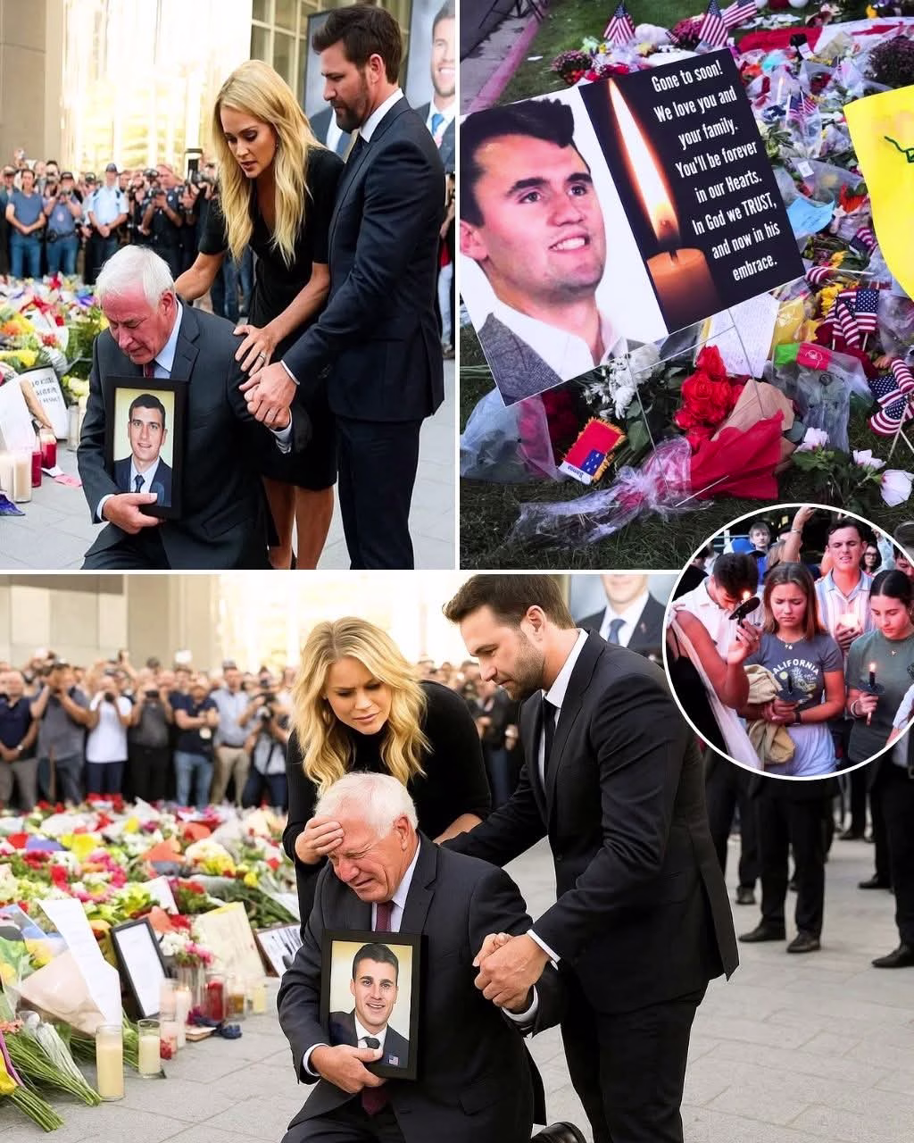 At a makeshift memorial outside Turning Point USA’s Phoenix headquarters, grief became almost unbearable. Charlie Kirk’s father clutched a framed photo of his son, sank to his knees, and sobbed aloud: “Give me back my boy… he’s only 31!” The crowd fell silent, overwhelmed by the rawness of his pain.