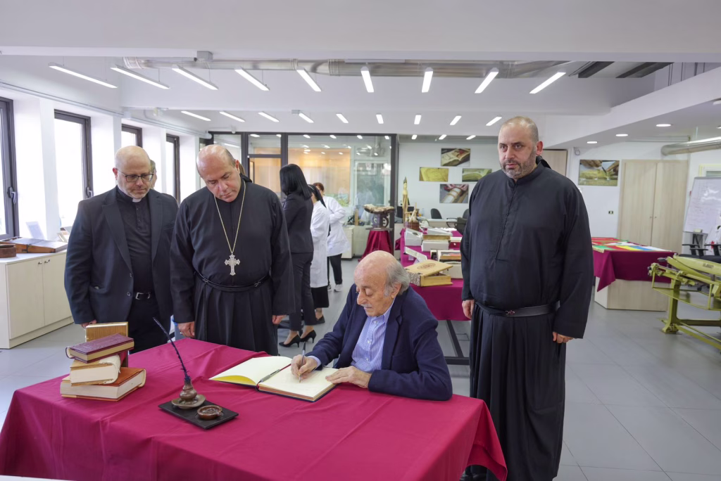 وجال جنبلاط وعقيلته في أرجاء الجامعة، وخصوصًا في المكتبة التي تحتوي على إرثٍ كبيرٍ من تاريخ لبنان، واطّلعا على كيفيّة معالجة المخطوطات والخرائط والكتب القديمة، كما زارا متحف الجامعة الذي يحتوي على كميّة كبيرة من اللوحات الفنيّة لأبرز الرسّامين اللبنانيّين، من أجيالٍ ومدارس مختلفة.