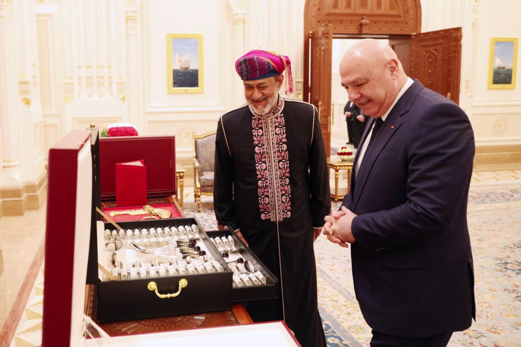 كما قدم سلطان عمان لرئيس الجمهورية خنجرا عمانيا مذهبا فيما قدم الرئيس عون للسلطان هيثم بن طارق طقما جزينيا.