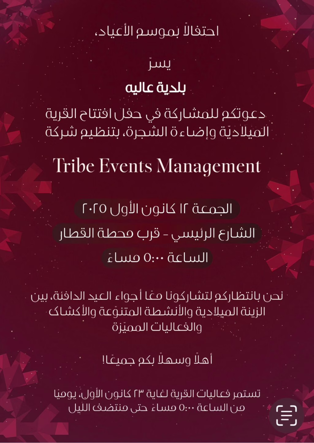 🎄يسرّ رئيس بلدية عاليه السيد وجدي مراد وأعضاء المجلس البلديدعوتكم للمشاركة في حفل إضاءة شجرة العيد وافتتاح السوق الميلادي، وذلك وفق التفاصيل الواردة في الدعوة المرفقة.مع أطيب التحيات،لجنة الإعلام والعلاقات العامة بلدية عاليه