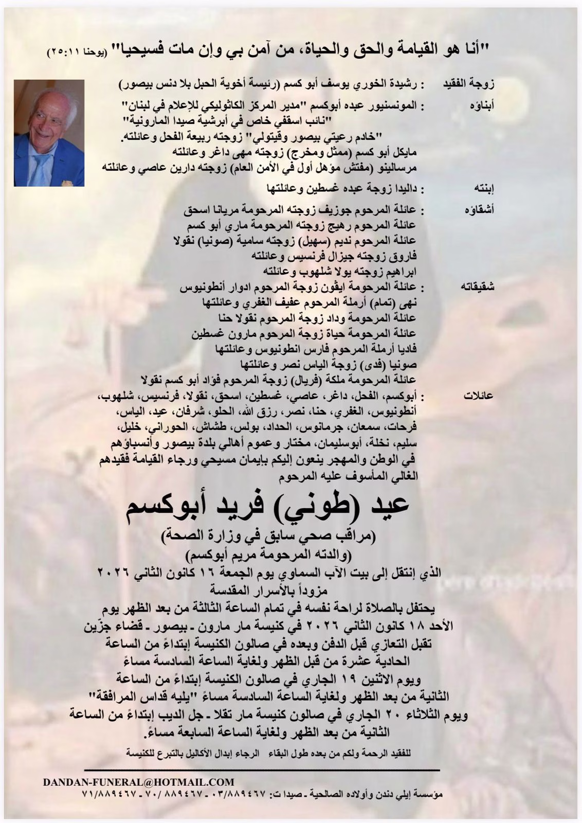 انتقل الى رحمته تعالى الشيخ الجليل عيد فريد أبو كسم، المعروف بطوني، والد المونسنيور عبده أبو كسم مدير المركز الكاثوليكي للإعلام والنائب الأسقفي في أبرشية صيدا.