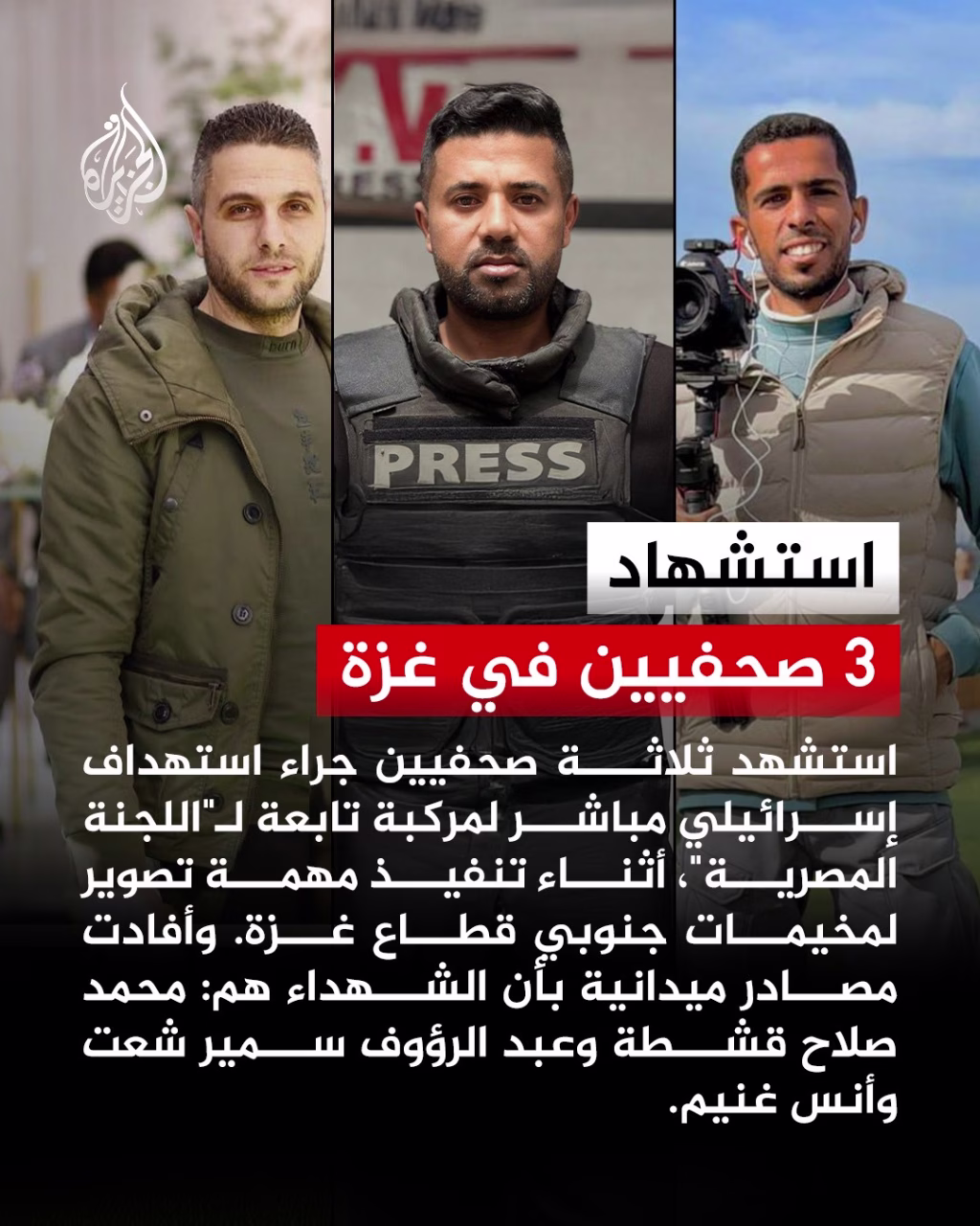 أثناء تنفيذ مهمة تصوير لمخيمات النازحين.. الجيش الإسرائيلي يستهدف مركبة إعلامية تابعة لــ”اللجنة المصرية” في منطقة نتساريم جنوبي قطاع غزة، ما أدى إلى استشهاد ثلاثة صحفيين هم: محمد صلاح قشطة وعبد الرؤوف سمير شعت وأنس غنيم.