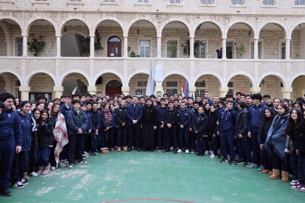 النشيد الوطني، فكلمة الاب سعادة التي جاء فيها:”نقف اليوم بخشوع أمام نصب الشهداء، شهداء المدرسة، مستحضرين معاني التضحية ومجددين الوعد على التمسك بالقيم التي استشهد من أجلها جميع الابطال وعلى رأسهم الشيخ بشير الجميّل.
