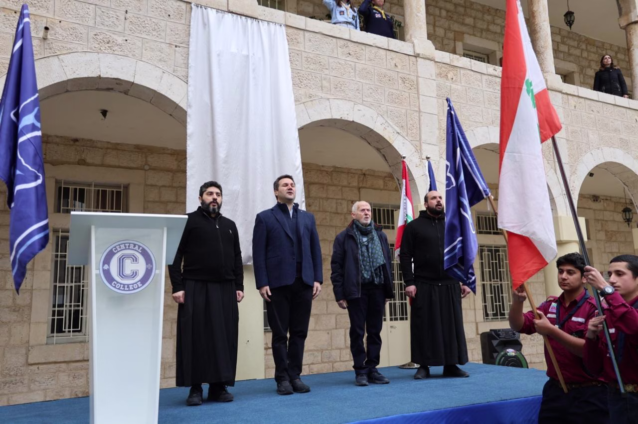 بعد الصلاة في كنيسة المدرسة، توجه الحضور إلى باحة المدرسة حيث ازيحت الستارة عن اللوحة ووضع النائب الحميل والاب سعادة اكليلا من الزهر على اللوحة .