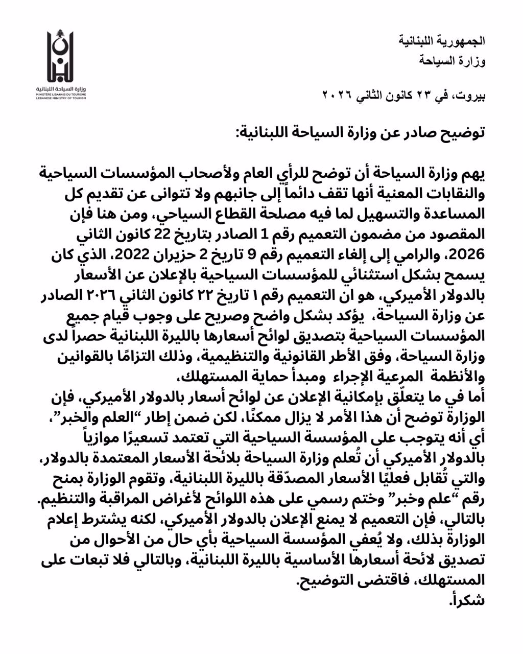 يهم وزارة السياحة أن توضح للرأي العام ولأصحاب المؤسسات السياحية والنقابات المعنية أنها تقف دائماً إلى جانبهم ولا تتوانى عن تقديم كل المساعدة والتسهيل لما فيه مصلحة القطاع السياحي، ومن هنا فإن المقصود من مضمون التعميم رقم 1 الصادر بتاريخ 22 كانون الثاني 2026، والرامي إلى إلغاء التعميم رقم 9 تاريخ 2 حزيران 2022، الذي كان يسمح بشكل استثنائي للمؤسسات السياحية بالإعلان عن الأسعار بالدولار الأميركي، هو ان التعميم رقم ١ تاريخ ٢٢ كانون الثاني ٢٠٢٦ الصادر عن وزارة السياحة، يؤكد بشكل واضح وصريح على وجوب قيام جميع المؤسسات السياحية بتصديق لوائح أسعارها بالليرة اللبنانية حصراً لدى وزارة السياحة، وفق الأطر القانونية والتنظيمية، وذلك التزامًا بالقوانين والأنظمة المرعية الإجراء ومبدأ حماية المستهلك،