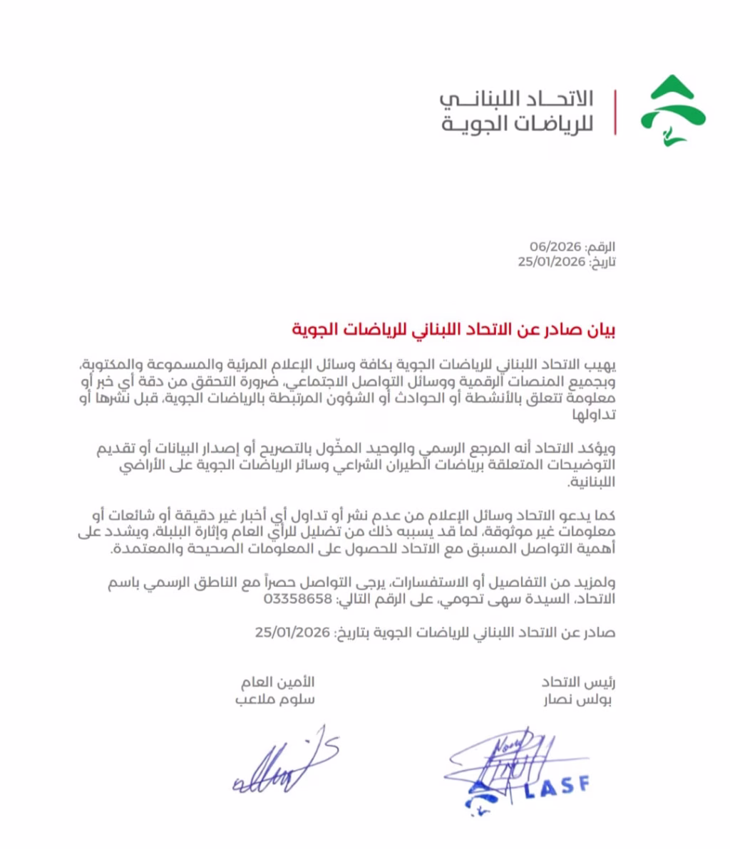 يهيب الاتحاد اللبناني للرياضات الجوية بكافة وسائل الإعلام المرئية والمسموعة والمكتوبة، وبجميع المنصات الرقمية ووسائل التواصل الاجتماعي، ضرورة التحقق من دقة أي خبر أو معلومة تتعلق بالأنشطة أو الحوادث أو الشؤون المرتبطة بالرياضات الجوية، قبل نشرها أو تداولها.