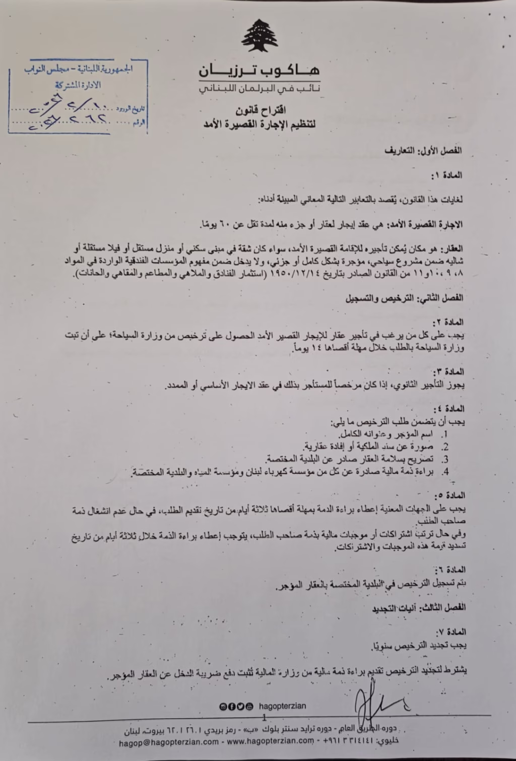 وانطلاقًا من ذلك، تقدّمتُ باقتراح قانون لتنظيم الإيجارات القصيرة الأمد، يهدف إلى تحقيق ما يلي: