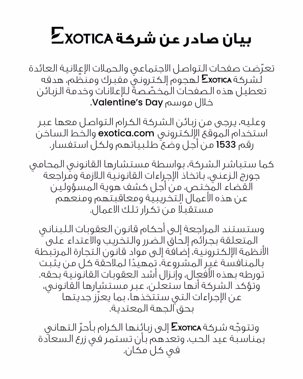 تعرّضت صفحات التواصل الاجتماعي والحملات الإعلانية العائدة لشركة EXOTICA لهجوم إلكتروني منظّم ومتعّمد، هدفه تعطيل هذه الصفحات المخصّصة للإعلانات وخدمة الزبائن خلال موسم Valentine’s Day.