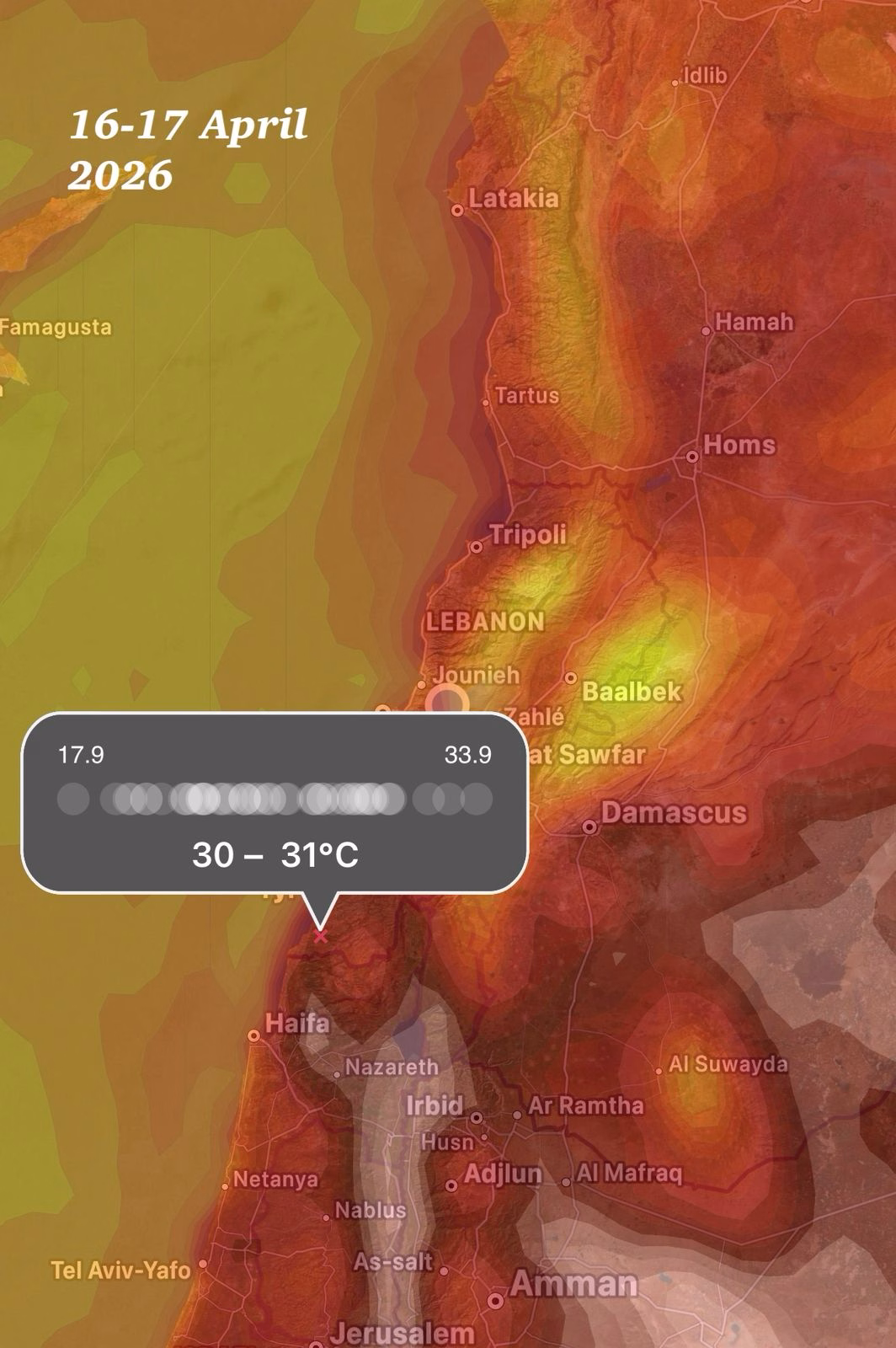 من المنتظر ان تنشط رياح جنوبية شرقية مصدرها الربع الخالي في شبه الجزيرة العربية، نحو الاردن وسيناء يقابلها تمدد كتل حارة من صحراء مصر وليبيا شرقاً، الامر الذي سيرفع درجات الحرارة في لبنان وسوريا وفلسطين والاردن اعتباراً من يوم الثلاثاء ولغاية يوم السبت صباحاً من الاسبوع المقبل، وستشتد فعالية الكتل الدافئة بين الأربعاء ظهراً ويوم الجمعة، لتبلغ ذروتها يومي الخميس والجمعة فتصل الحرارة في البقاع الى 27 درجة وفوق الجبال الغربية 24-25 درجة، وفي الشمال 26-28 وفي الساحل الوسط 28-29 درجة، اما في الجنوب 30-31 درجة، سوف تترافق هذه الرياح الخماسينيّة مع غبار ابيض سيغطي لبنان والمنطقة بنسبة 80%.