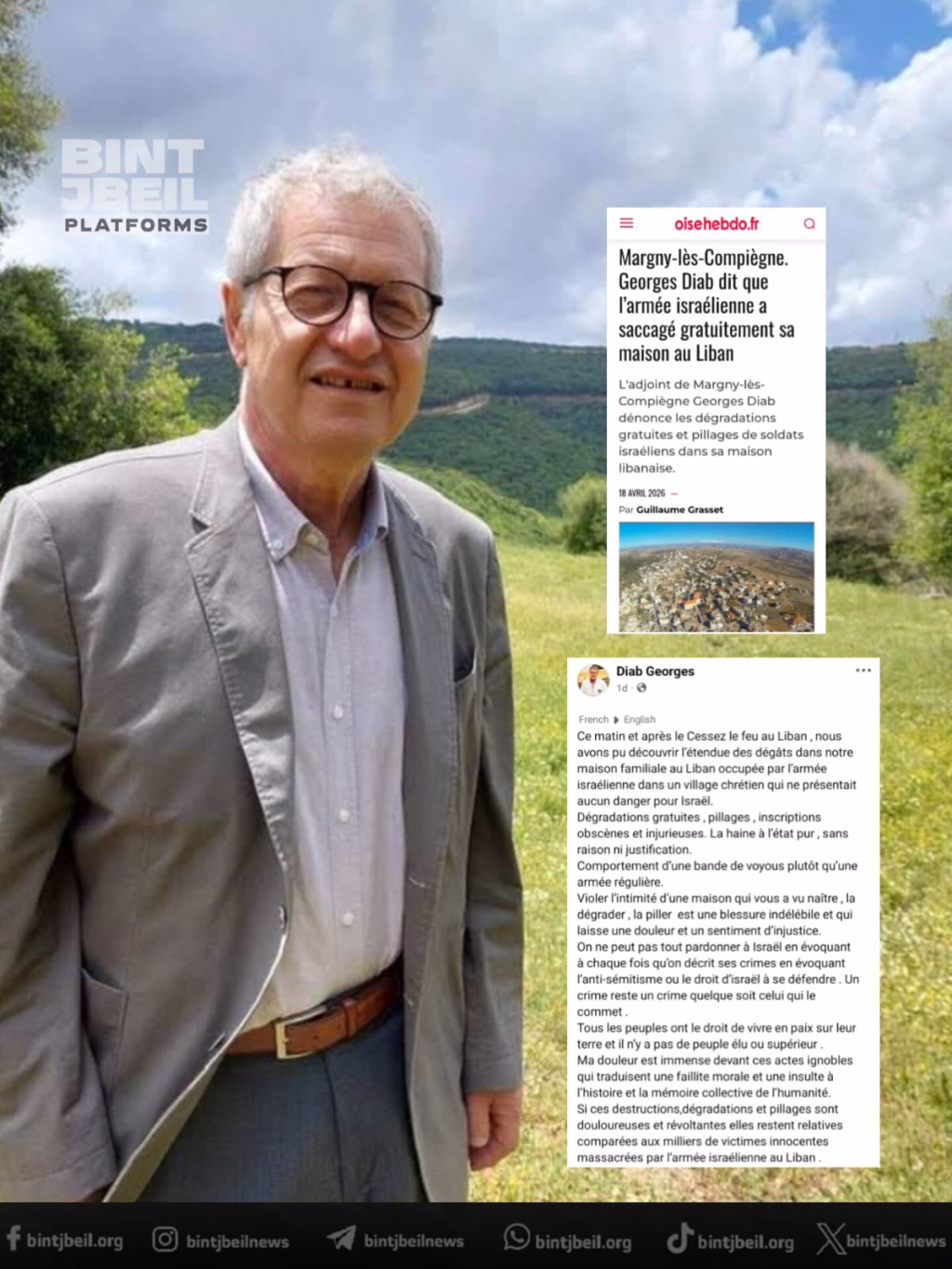 تناولت منصة اعلامية فرنسية ما نشره ابن عين ابل السيد جورج دياب، نائب رئيس بلدية “مارني-ليه-كومبيين” الفرنسية، وقد تحدث عما تعرض له منزل عائلته في بلدته الجنوبية من تخريب مجاني، نهب، وكتابات بذيئة ومسيئة على يد جنود الجيش الإسرائيلي.