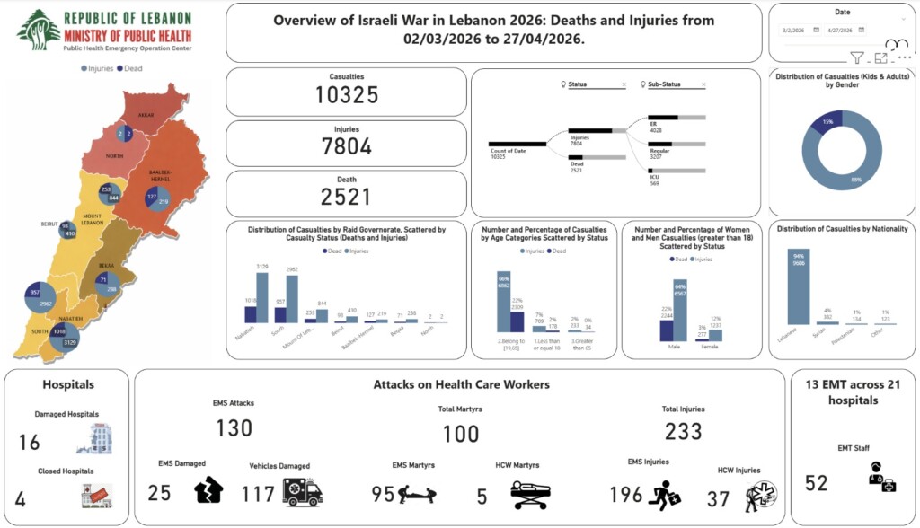 صدر عن مركز عمليات طوارئ الصحة التابع لوزارة الصحة العامة بيان أعلن أن الحصيلة التراكمية الاجمالية للعدوان منذ 2 آذار حتى 27 نيسان باتت كالتالي :